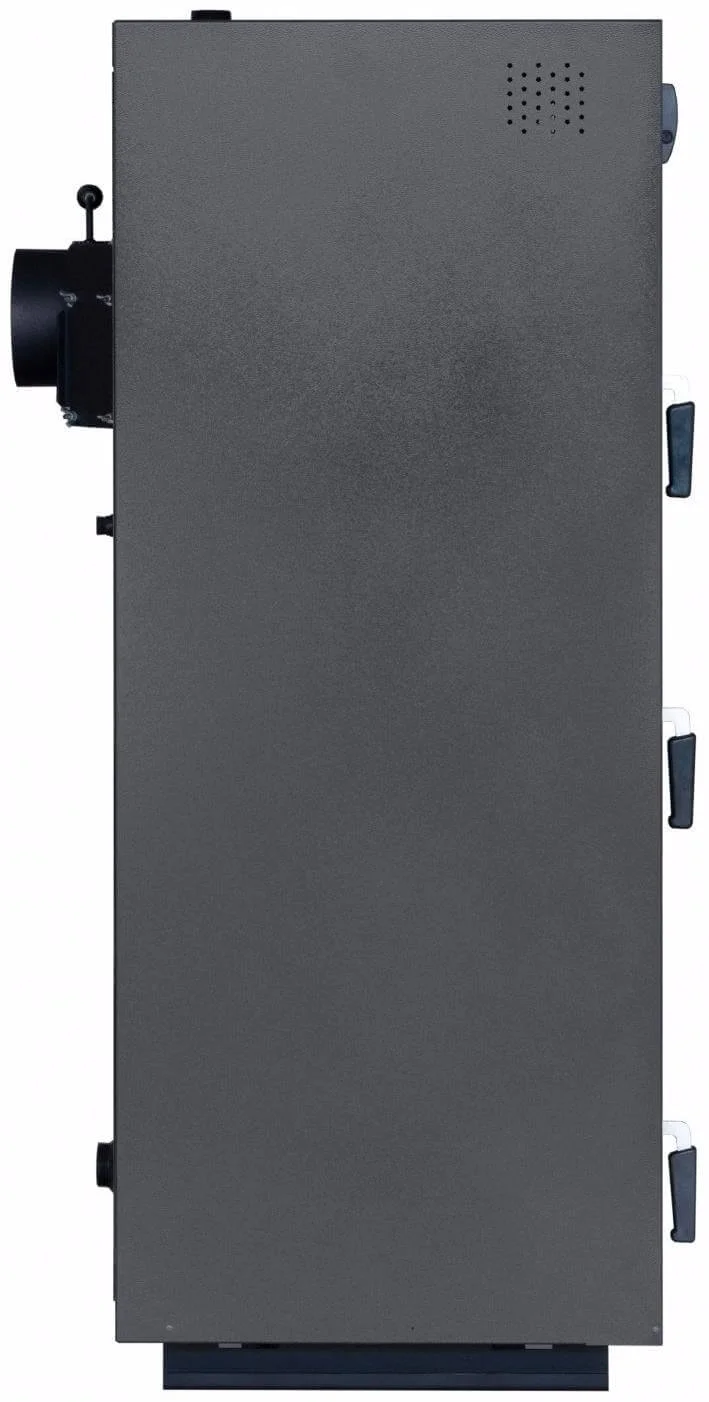 Теплообмінник котла виготовлений зі сталі товщиною 5 мм та має водонаповнені горизонтальні перегородки, а також водяні колосники, що забезпечує максимальний відбір тепла. Велика містка топка є ключовою перевагою, що сприяє тривалості горіння. Котел оснащений вбудованою автоматикою та вентилятором наддуву повітря, що підвищує ККД до 85% та робить експлуатацію більш комфортною. Водяні колосники обладнані шурувальним механізмом з ручкою для зручного очищення. Димохідний вихід розташований на задній стінці та має заслінку для регулювання тяги, а дверцята ущільнені керамічним шнуром для запобігання виходу диму.