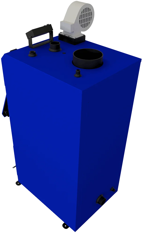 Конструкція котла являє собою збірно-зварний агрегат, що складається з корпусу та камери згоряння. Конвектор виконаний з ряду товстостінних безшовних труб та має двоходовий теплообмінник, що підвищує ефективність теплопередачі. Між подвійними стінками котла розташовані водяні перегородки, а зовнішня частина корпусу має теплоізоляційний шар під декоративним облицюванням. Управління робочими процесами здійснюється мікропроцесорним регулятором, який стабілізує температуру теплоносія, регулює оберти нагнітального вентилятора та захищає систему від закипання. Теплообмінник виготовлений зі сталі товщиною 5 мм, що забезпечує надійність та довговічність.