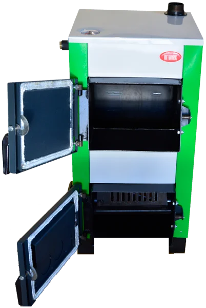 Водний об'єм котла, так звана «водяна сорочка», утворюється між зовнішніми стінками теплообмінника, топкою та димоходом, забезпечуючи ефективний відбір тепла. Топка котла шахтно-шарового типу, а завантажувальна ємність розташована від колосникової решітки до завантажувального вікна. Для ручного регулювання кількості повітря, що подається в топку, на нижніх дверцятах закріплена повітряна заслінка з регулювальним гвинтом. На задній стінці теплообмінника розташований димохід із шибером для регулювання розрідження за котлом, а температура води на виході контролюється вбудованим термометром.