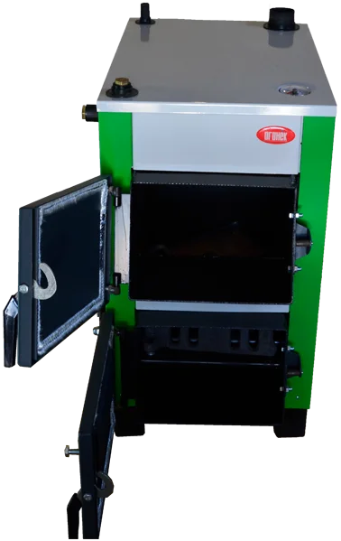 Основою котла є сталевий теплообмінник прямокутної форми, що включає топку, корпус та газохід. Водний об'єм котла, або водяна сорочка, утворений між зовнішніми стінками теплообмінника, топкою та димоходом. У нижній частині теплообмінника розташована камера для збору золи, обмежена колосниковою решіткою та піддоном. Зовні теплообмінник покритий декоративним кожухом. Топка котла шахтно-шарового типу. На передній стінці теплообмінника розміщені дверцята для обслуговування колосникової решітки, зольної камери, завантаження палива та очищення конвективного газоходу. Нижні дверцята оснащені повітряною заслінкою з регулювальним гвинтом для ручного контролю подачі повітря, а димохід має шибер для регулювання розрідження. Температура води на виході з котла контролюється термометром, а ККД досягає 80%.
