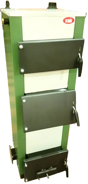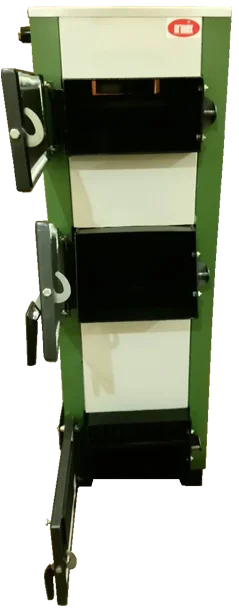 Топка котла має шахтно-шаровий тип, а завантажувальна ємність простягається від колосникової решітки до завантажувального вікна. На передній стінці теплообмінника розміщені дверцята для обслуговування колосникової решітки, зольної камери, завантаження палива та очищення конвективного газоходу. Нижні дверцята оснащені повітряною заслінкою з регулювальним гвинтом для ручного контролю подачі повітря в топку. На задній стінці закріплений димохід з шибером для регулювання розрідження за котлом, а термометр контролює температуру води на виході.