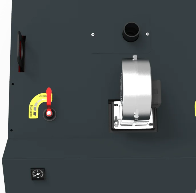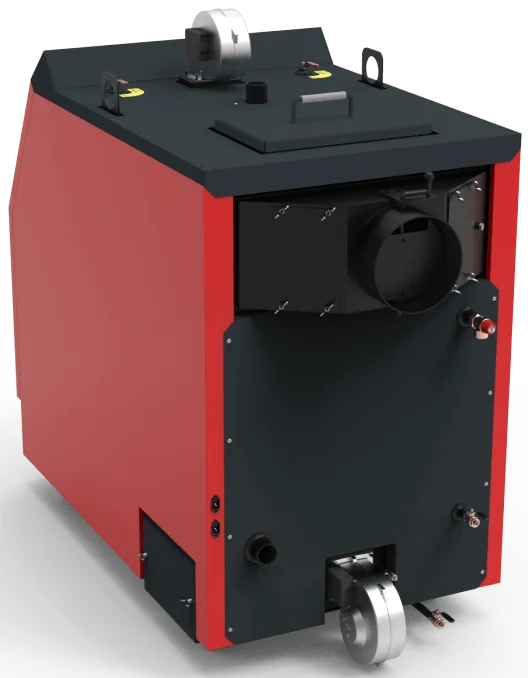 Для інтенсифікації процесу горіння передбачена можливість встановлення вентиляторів, а система керування котлом підтримує ручний та автоматичний режими роботи електроприводів (вентилятора, циркуляційного насоса, шнека). Автоматизація дозволяє контролювати наявність палива, підтримувати задану температуру теплоносія та автоматично вимикати вентилятор при досягненні критичного значення 95°С. Котел має високий ККД 93% та призначений для опалення площі до 2000 м².
