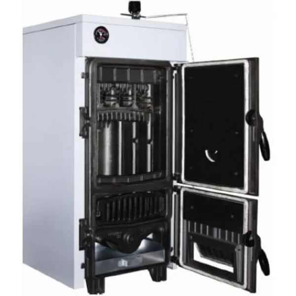 Чавунний теплообмінник відрізняється високою стійкістю до корозії та довговічністю, зберігаючи свої властивості протягом тривалого терміну експлуатації. Специфічна форма секцій теплообмінника сприяє збалансованому згорянню палива з низьким рівнем викидів газів. Для зручності використання та обслуговування передбачені великі дверцята для завантаження палива та очищення камери згоряння. Котел оснащений термоманометром та механічним терморегулятором, який автоматично контролює подачу повітря для горіння, підтримуючи задану температуру.