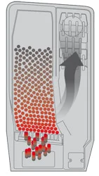 - Ефективне згоряння: Метод прогорання та відгорання з подачею первинного, вторинного та третинного повітря.