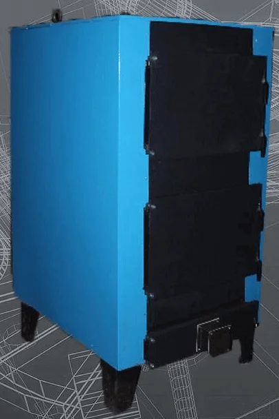 Основою котла є сталевий теплообмінник прямокутної форми, що включає топку, корпус та газохід. Між зовнішніми стінками теплообмінника, топкою та димоходом утворено водний об'єм – "водяну сорочку", яка забезпечує ефективну передачу тепла. Топка котла шахтно-шарового типу, а завантажувальна ємність простягається від колосникової решітки до завантажувального вікна. У нижній частині теплообмінника розташована камера для збору золи, обмежена стінками, колосниковою решіткою та піддоном. Коефіцієнт корисної дії котла становить 80%.