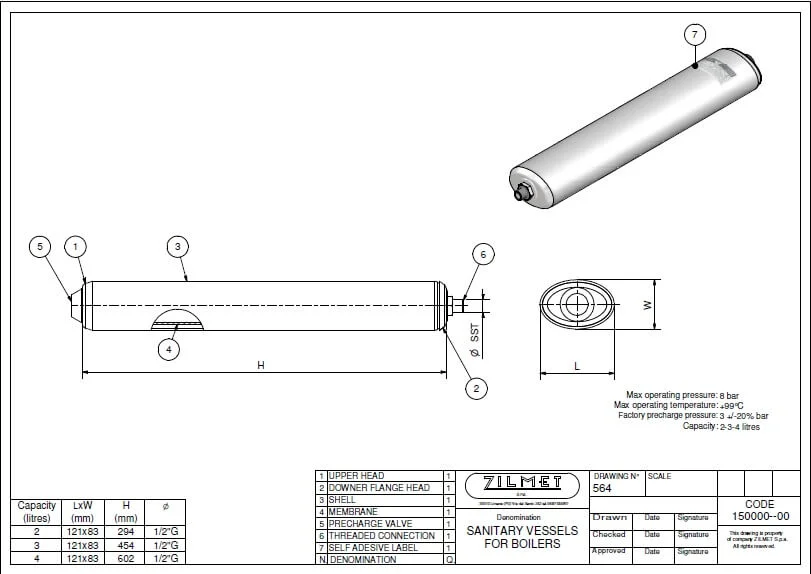 Розширювальний бак об'ємом 4 літри призначений для компенсації теплового розширення води у системі гарячого водопостачання газового котла. Модель розрахована на роботу в діапазоні температур до +90 °C та максимальний тиск 0,3 МПа, що забезпечує стабільність системи при нагріванні теплоносія. Підключення здійснюється через різьбовий патрубок розміром 1/2 дюйма.