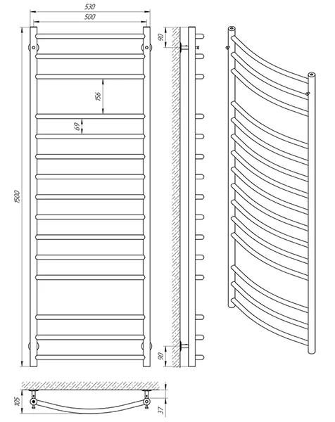 Конструкція рушникосушки включає стійки діаметром Ø30 мм з товщиною стінки 2 мм та перемички Ø20 мм з товщиною 1,5 мм, що гарантує надійність та ефективну тепловіддачу 399 Вт. Підключення до системи здійснюється через внутрішню різьбу 1/2", з нижнім способом підключення. Міжосьова відстань становить 500 мм, а загальні габарити – 530 мм завширшки та 1500 мм заввишки.