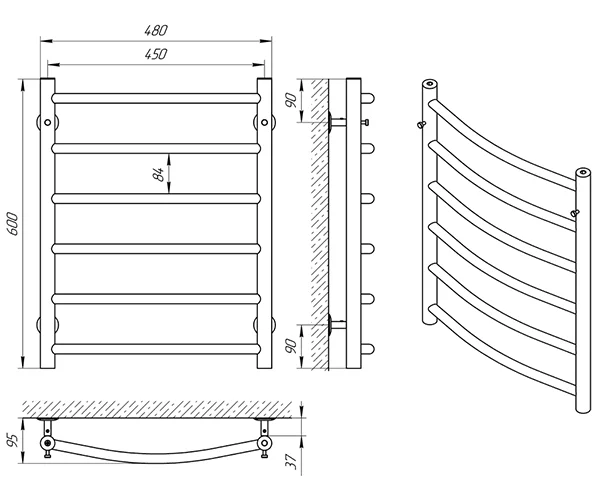 Конструкція рушникосушки включає стійки діаметром 30 мм з товщиною стінки 2 мм та перемички діаметром 20 мм з товщиною 1.5 мм, що гарантує надійність та міцність виробу. Пристрій розрахований на робочий тиск до 1.5 МПа (15 бар) та температуру теплоносія до 100 °С, забезпечуючи теплову потужність 149 Вт.