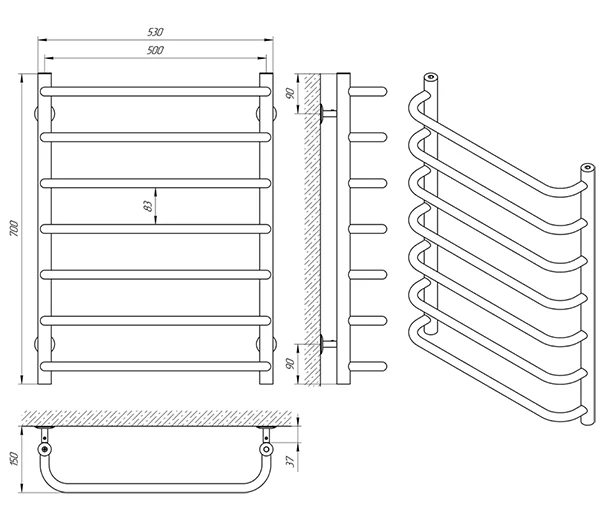 Модель має міжосьову відстань 500 мм та висоту 700 мм, при загальній ширині 530 мм, що дозволяє ефективно використовувати простір ванної кімнати. Тепловіддача пристрою становить 213 Вт, забезпечуючи швидке висушування рушників та підтримання комфортної температури.