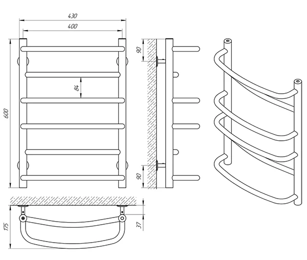 Модель має габаритні розміри 600 мм у висоту та 430 мм у ширину, з міжосьовою відстанню 400 мм для нижнього підключення 1/2". Робочий тиск до 15 бар та максимальна температура теплоносія до 100°С дозволяють використовувати рушникосушку в різних системах опалення. Тепловіддача пристрою становить 156 Вт, що забезпечує швидке висихання текстильних виробів та ефективний обігрів приміщення.