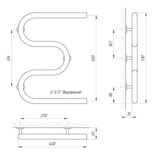 Конструкція "Змійовик" з трубами діаметром Ø30 мм та товщиною стінки 1,5 мм гарантує ефективну тепловіддачу та швидке сушіння рушників. Бічне підключення з внутрішньою різьбою 1/2" спрощує монтаж до існуючої системи. Завдяки своїм розмірам 400 мм (ширина) на 530 мм (висота) та міжосьовій відстані 500 мм, рушникосушка легко інтегрується у ванні кімнати різного розміру.