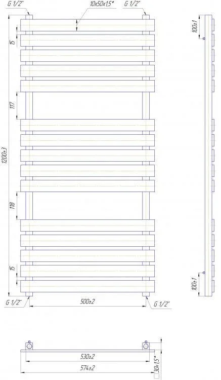 Конструкція рушникосушки включає 15 ребер, що забезпечує значну площу для сушіння та тепловіддачу 527 Вт, сприяючи підтримці комфортної температури в приміщенні. Робочий тиск до 9 бар та міжосьова відстань 500 мм з нижнім підключенням 1/2" роблять її сумісною з більшістю систем гарячого водопостачання та опалення. Висота моделі становить 1200 мм, ширина — 560 мм.