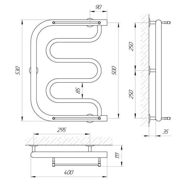 Конструкція рушникосушки включає стійки діаметром Ø30 мм з товщиною стінки 2 мм та перемички Ø20 мм з товщиною 1,5 мм, що гарантує міцність та надійність виробу. Бічне підключення з внутрішньою різьбою 1/2" спрощує монтаж до існуючих комунікацій. Рушникосушка розрахована на робочий тиск до 15 бар та температуру теплоносія до 100 °С, що відповідає стандартам систем опалення. При габаритних розмірах 530 мм у висоту та 400 мм у ширину, з міжосьовою відстанню 500 мм, вона забезпечує тепловіддачу 109 Вт, ефективно підтримуючи комфортну температуру та сухість у приміщенні.