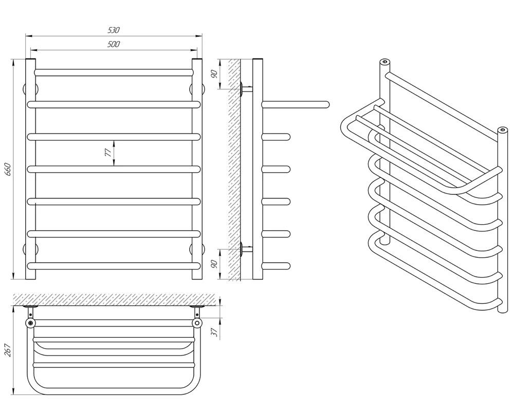 Рушникосушка Laris Стандарт П7 має міжосьову відстань 500 мм та висоту 660 мм, що робить її придатною для встановлення у ванних кімнатах різного розміру. Нижнє підключення з внутрішньою різьбою 1/2" спрощує монтаж до існуючих комунікацій. Завдяки тепловій потужності 237 Вт, пристрій ефективно підтримує комфортну температуру в приміщенні та швидко висушує рушники.