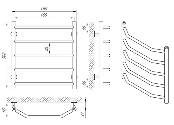 Конструкція рушникосушки включає стійки діаметром Ø30 мм з товщиною стінки 2 мм та перемички Ø20 мм з товщиною 1,5 мм, що гарантує міцність та довговічність виробу. Завдяки висоті 500 мм та ширині 480 мм, а також міжосьовій відстані 450 мм, модель забезпечує достатню площу для сушіння. Теплова потужність становить 113 Вт, що дозволяє ефективно підтримувати комфортну температуру. Підключення здійснюється через внутрішню різьбу 1/2" знизу, що спрощує монтаж.