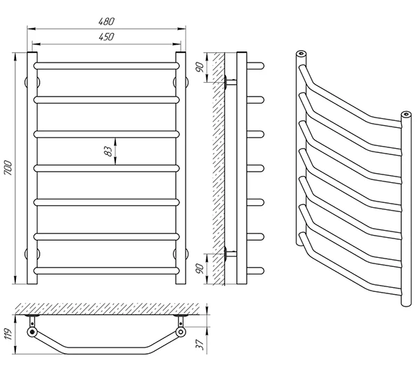 Модель має міжосьову відстань 450 мм, загальну висоту 700 мм та ширину 480 мм, що робить її зручною для розміщення в більшості ванних кімнат. Рушникосушка розрахована на робочий тиск до 15 бар, а параметри теплоносія можуть досягати 1,5 МПа та температури до 100°С. Тепловіддача пристрою становить 179 Вт, забезпечуючи швидке висихання речей. Діаметр стійки складає Ø30 мм (товщина 2 мм), а перемички — Ø20 мм (товщина 1,5 мм), що гарантує міцність та надійність конструкції.