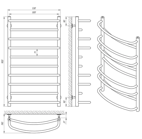 Рушникосушка розрахована на робочий тиск до 15 бар (1,5 МПа) та температуру теплоносія до 100°С, що гарантує її надійність та безпеку в експлуатації. Діаметр стійок становить Ø30 мм з товщиною стінки 2 мм, а перемичок – Ø20 мм з товщиною 1,5 мм, що забезпечує міцність конструкції. Підключення до системи здійснюється через внутрішню різьбу 1/2" з нижнім способом підключення, а міжосьова відстань становить 500 мм.