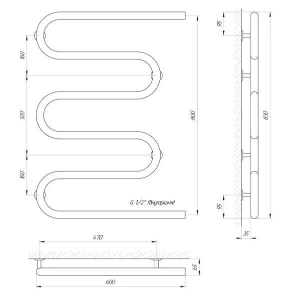 Конструкція рушникосушки має бічне підключення з різьбою 1/2", що спрощує монтаж до існуючих комунікацій. Оптимальні розміри 600 мм завширшки та 830 мм заввишки, з міжосьовою відстанню 800 мм, дозволяють інтегрувати виріб у ванні кімнати різної площі. Пристрій розрахований на робочий тиск до 15 бар (1.5 МПа) та температуру теплоносія до 100 °С, що відповідає стандартам для систем опалення.