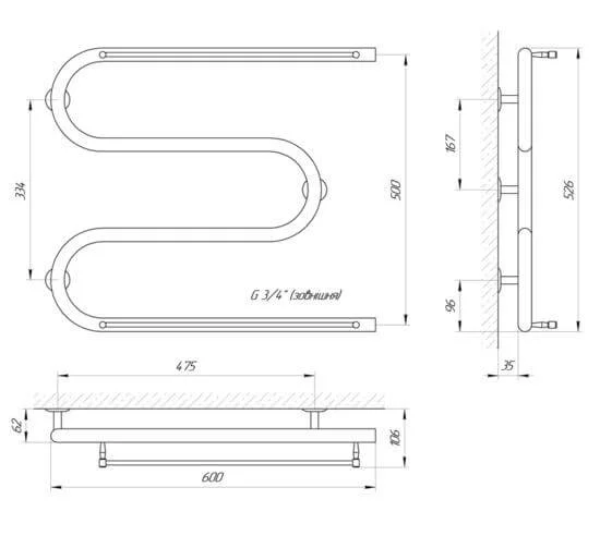 Пристрій призначений для підключення до системи автономного опалення з бічним способом підключення та міжосьовою відстанню 500 мм. Діаметр підключення становить 3/4 дюйма. Рушникосушка розрахована на робочий тиск до 15 бар та температуру теплоносія до 100 °С, що гарантує надійну експлуатацію. Загальні розміри моделі становлять 600 мм у ширину та 526 мм у висоту, а теплова потужність досягає 168 Вт, забезпечуючи ефективний обігрів та сушіння.