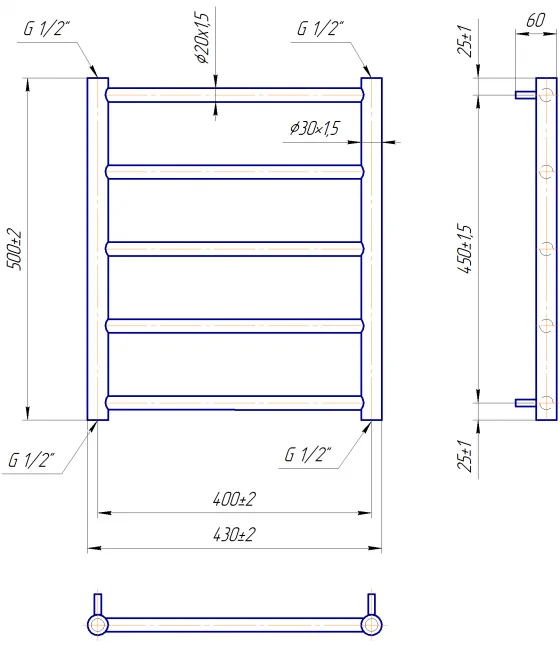 Висота рушникосушки становить 500 мм, ширина – 430 мм, а міжосьова відстань для підключення – 400 мм. Діаметр підключення складає 1/2", а спосіб підключення – нижній. Тепловіддача моделі становить 123 Вт, що забезпечує ефективне сушіння рушників та додатковий обігрів приміщення.