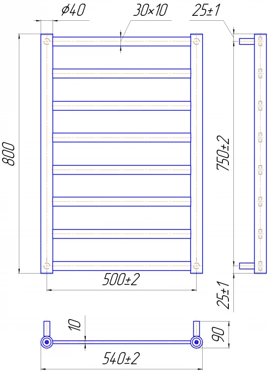 Модель має габаритні розміри 800 мм у висоту та 540 мм у ширину, з міжосьовою відстанню 500 мм для підключення. Завдяки тепловій потужності 259 Вт, рушникосушка ефективно висушує текстильні вироби та підтримує комфортну температуру у ванній кімнаті. Нижнє підключення з діаметром 1/2" спрощує монтаж до існуючих систем водопостачання.