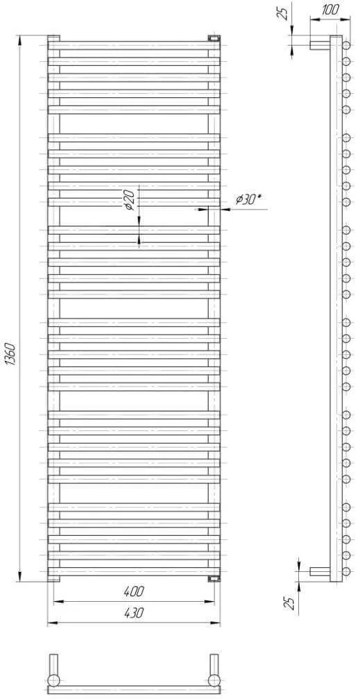 Водяна рушникосушка Mario Преміум Турин (1360 х 400 мм) виготовлена з харчової нержавіючої сталі AISI 304, що забезпечує високу стійкість до корозії та агресивного середовища. Пристрій має висоту 1360 мм та ширину 430 мм, з міжосьовою відстанню 400 мм для підключення.
