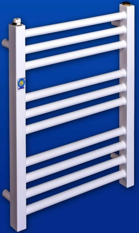 Водяна рушникосушка Polywarm Frankfurt WR 10/45 з емальованої сталі має висоту 500 мм та ширину 450 мм, що дозволяє ефективно обігрівати ванну кімнату та сушити рушники. Плоскі ребра радіатора сприяють оптимальній тепловіддачі 225 Вт та дозволяють розмістити виріб навіть в умовах обмеженого простору.