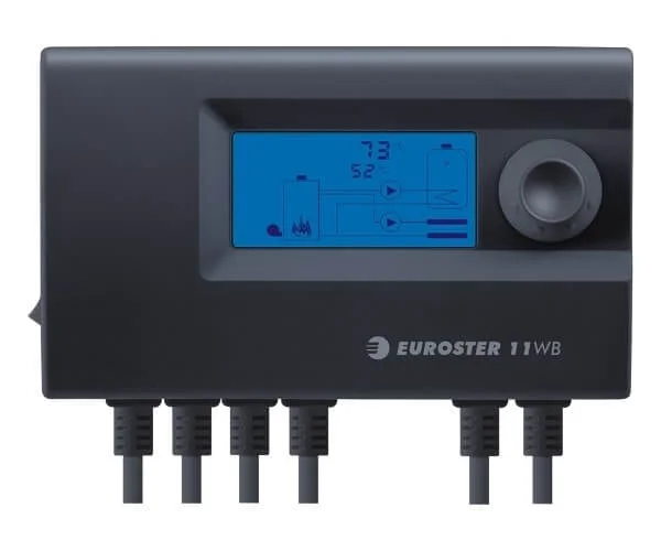 Оснащений великим LCD дисплеєм з інтуїтивно зрозумілим інтерфейсом для зручного налаштування. Контролер горіння Euroster 11WB забезпечує комплексне керування роботою твердопаливного котла, включаючи регулювання вентилятора, насосів опалення та бойлера непрямого нагріву.