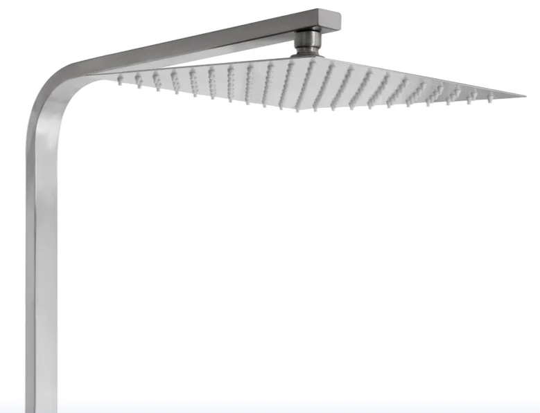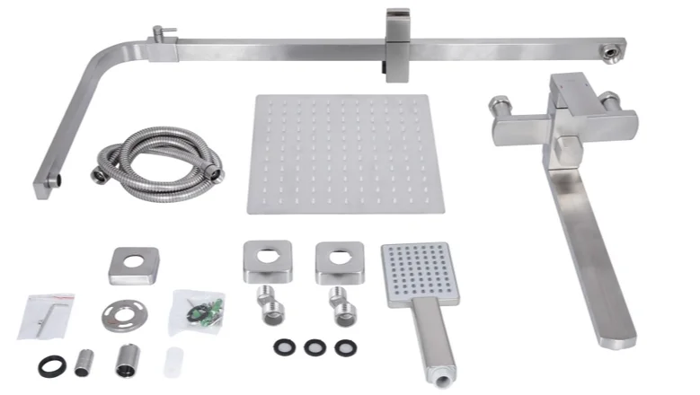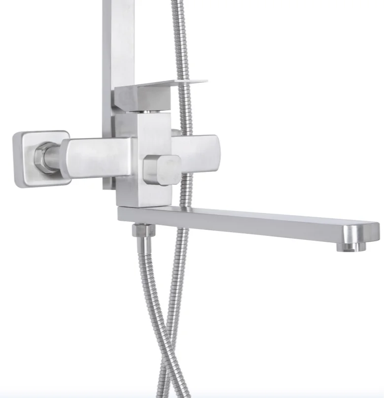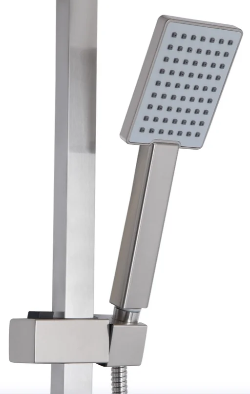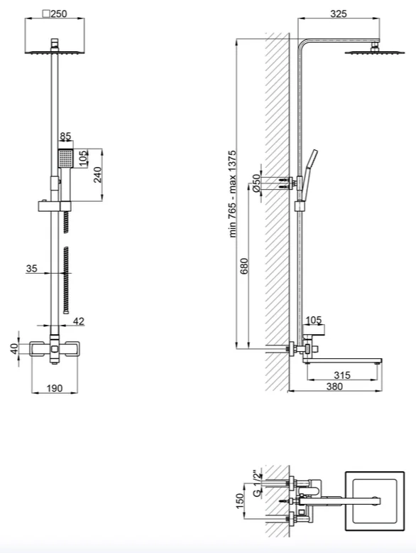 Душова стійка має регульовану висоту в діапазоні від 765 до 1375 мм, що дозволяє адаптувати її під індивідуальні потреби користувача. Верхній душ квадратної форми (250×250 мм) забезпечує широкий потік води, а прямокутна ручна лійка (85×105 мм) з одним режимом перемикання пропонує цілеспрямований потік. Довжина душового шланга становить 1500 мм, що забезпечує зручність використання. Поворотний вилив довжиною 315 мм додає функціональності, дозволяючи використовувати систему для наповнення ванни.