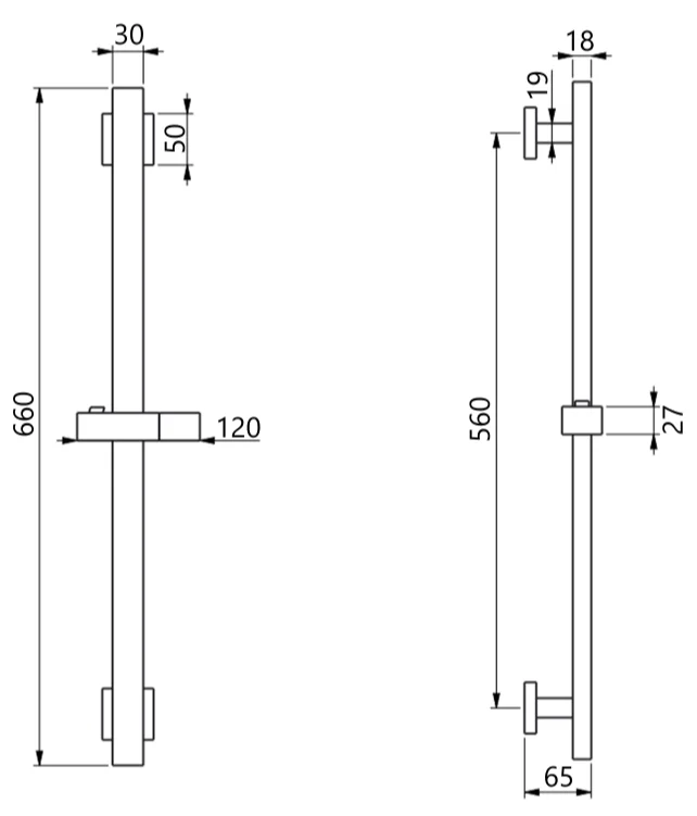Висота стійки становить 660 мм, що дозволяє регулювати положення тримача для душової лійки відповідно до індивідуальних потреб користувача. Комплектація включає штангу для душу, кронштейн для ручного душу та всі необхідні кріпильні деталі для швидкого та надійного встановлення.