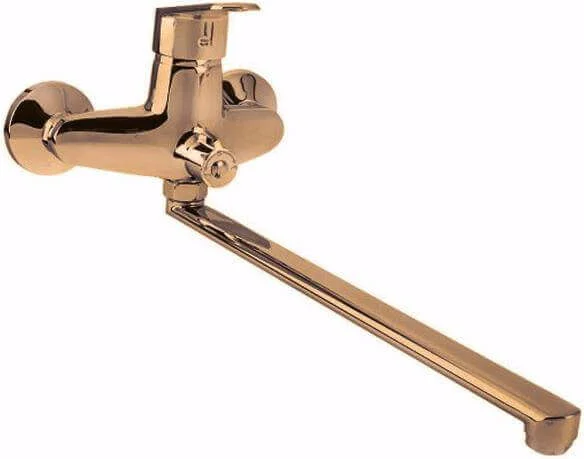 Настінний змішувач для ванної кімнати оснащений поворотним виливом довжиною 400 мм, що забезпечує зручний набір води. Управління температурою та напором здійснюється за допомогою однозахідного важеля, який керує керамічним картриджем діаметром 40 мм. Конструкція змішувача виконана з силуміну з бронзовим покриттям та включає пластикові елементи.