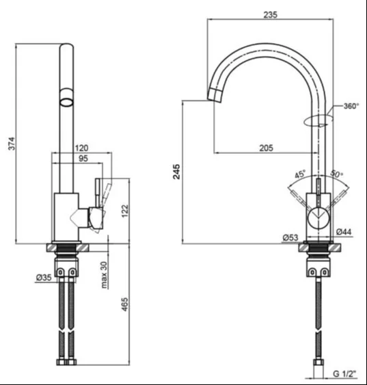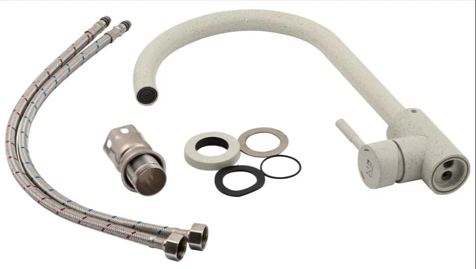 - Простий та швидкий монтаж: Гнучке підведення з підключенням М10х1/2" спрощує встановлення змішувача на мийку.