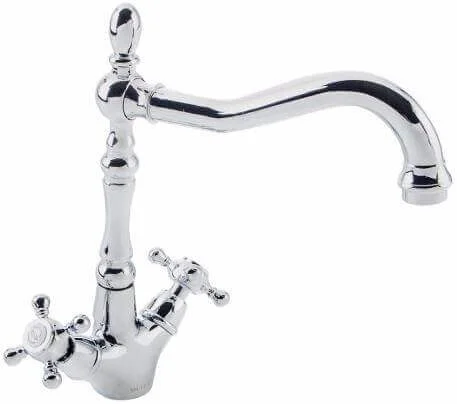 Двохзахватний змішувач Potato P4360 у ретро-стилі призначений для встановлення на кухонну мийку. Його конструкція з міцного силуміну та керамічних картриджів розрахована на регулярне використання в побутових умовах. Зручні хрестоподібні маховики з логотипом бренду забезпечують точне регулювання температури та напору води.