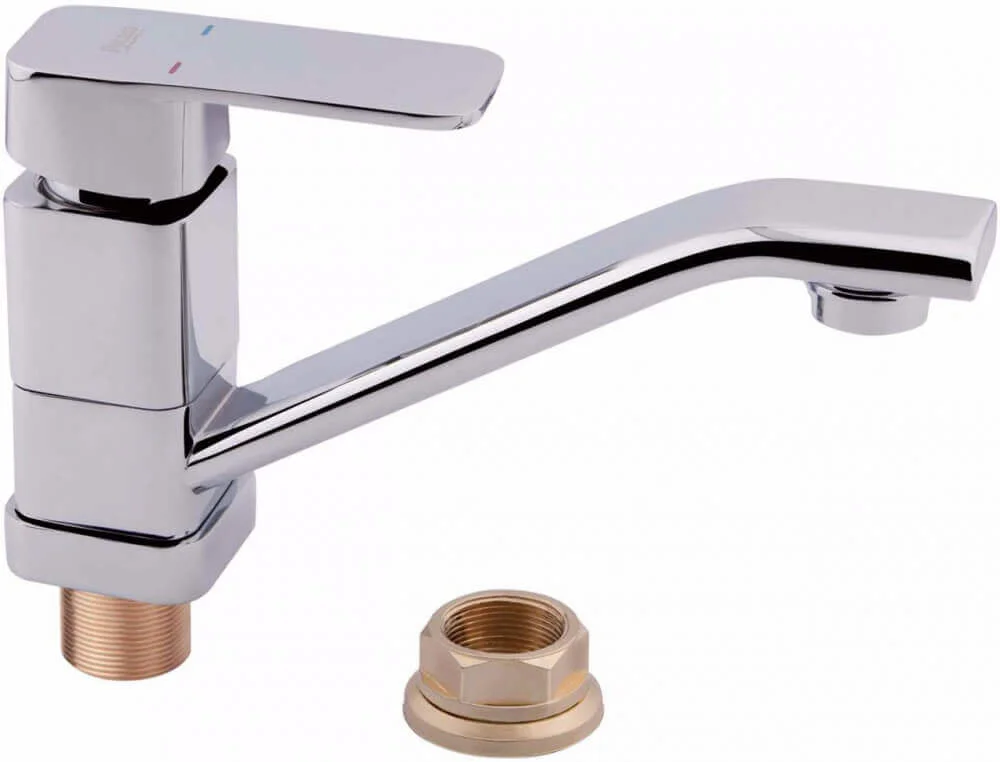 Однозахватний змішувач для кухонної мийки має поворотний вилив довжиною 180 мм, що забезпечує зручність наповнення посуду різних розмірів. Основним елементом керування водою є керамічний картридж, який забезпечує плавне регулювання температури та напору. Монтаж виконується в одне отвір мийки за допомогою вертикального кріплення, а підведення води здійснюється через гнучкі підводки з різьбою 1/2".