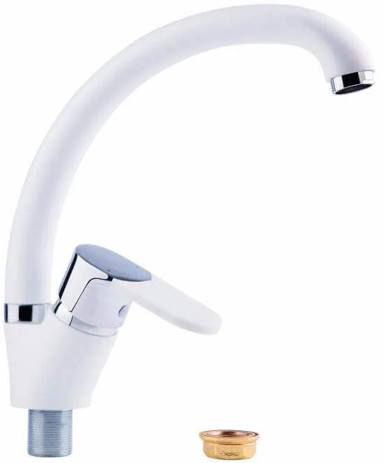 Змішувач для кухонної мийки має вертикальний спосіб монтажу в одне отвір. Виконаний з силуміну з покриттям нікель/хром та білою емаллю, він оснащений керамічним картриджем для плавного регулювання води. Вилив довжиною 210 мм традиційної форми забезпечує зручність наповнення посуду.