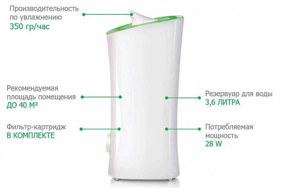 Прилад забезпечує інтенсивне зволоження до 350 мл/год, швидко досягаючи бажаного рівня вологості. Розпилювач з обертанням на 360° дозволяє рівномірно розподіляти вологу по всьому об'єму кімнати. Завдяки ємності резервуара для води 3.6 літра, зволожувач може працювати тривалий час без необхідності частого доливання.