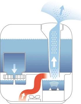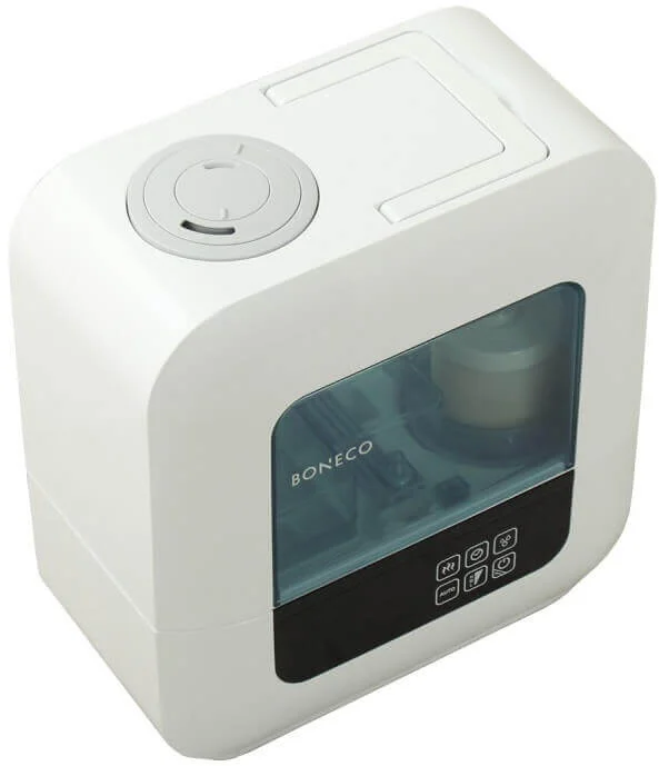 Модель оснащена інформативним сенсорним дисплеєм з функцією автозатемнення, який відображає актуальну інформацію про рівень вологості, встановлені режими та швидкість зволоження. Вбудований електронний гігростат автоматично підтримує заданий рівень вологості. Для очищення водопровідної води від солей жорсткості в комплекті передбачений фільтр-картридж, що забезпечує чисту та безпечну пару.