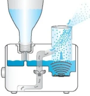 Ультразвуковий зволожувач повітря забезпечує продуктивність до 100 мл води на годину, що робить його ефективним для приміщень площею до 20 м². Пристрій працює від звичайної пластикової пляжки об'ємом до 1 літра, що виключає необхідність у окремому резервуарі та спрощує заправку. Енергоспоживання становить лише 12 Вт завдяки ультразвуковій технології.